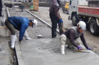 下地にワイヤーメッシュを配置し強度を確保したうえで、生コンクリートを流し込み、丁寧に均しながら表面を仕上げています。